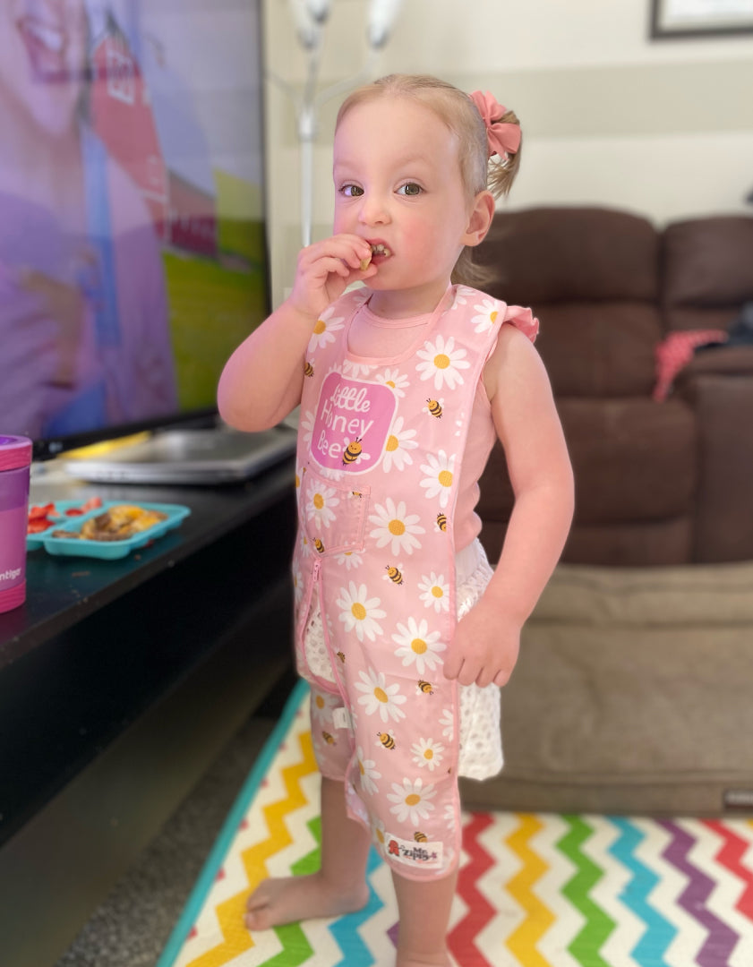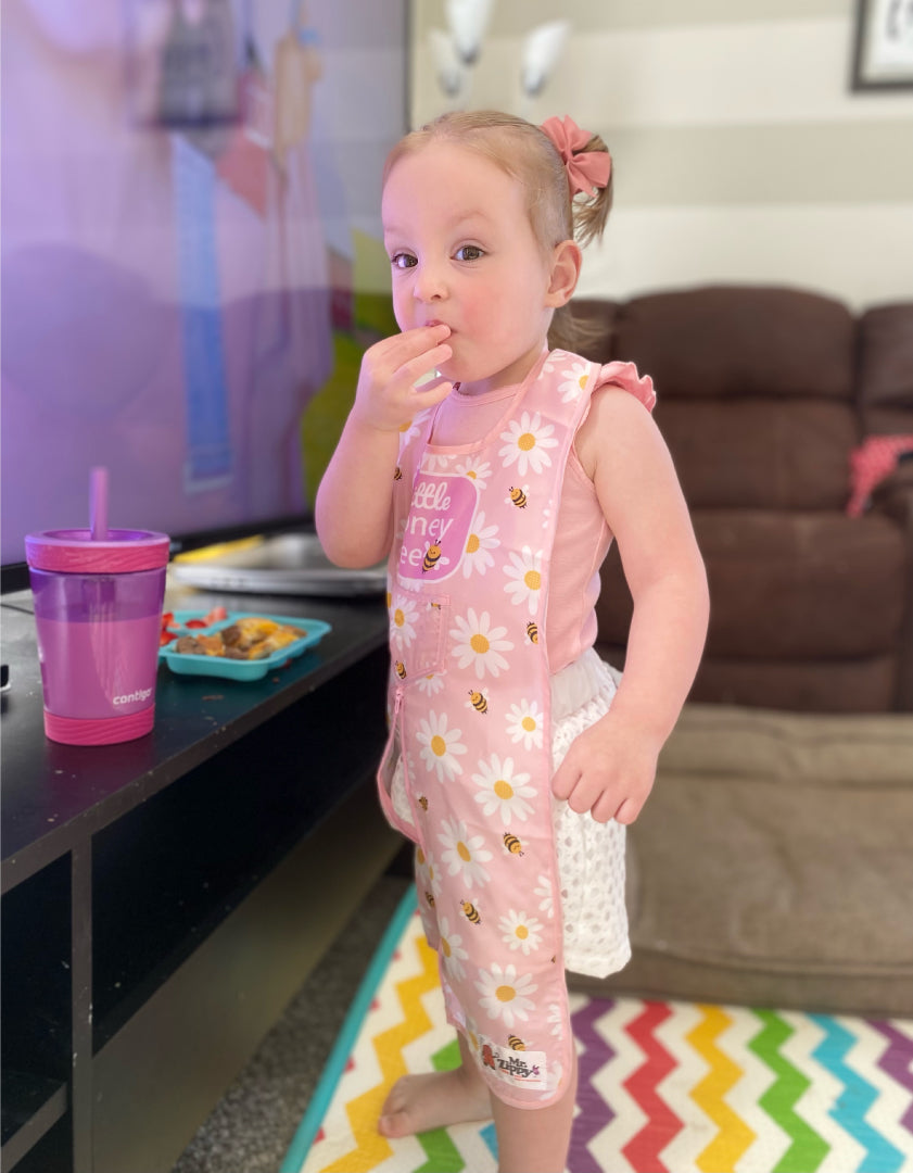 My oldest daughter isn’t a fan of the high chair and likes to be able to move around the kitchen/dining room while she eats. The Zippy Bib is just what we needed to give her the freedom she desires, and us the peace of mind that her clothes are protected from messes.