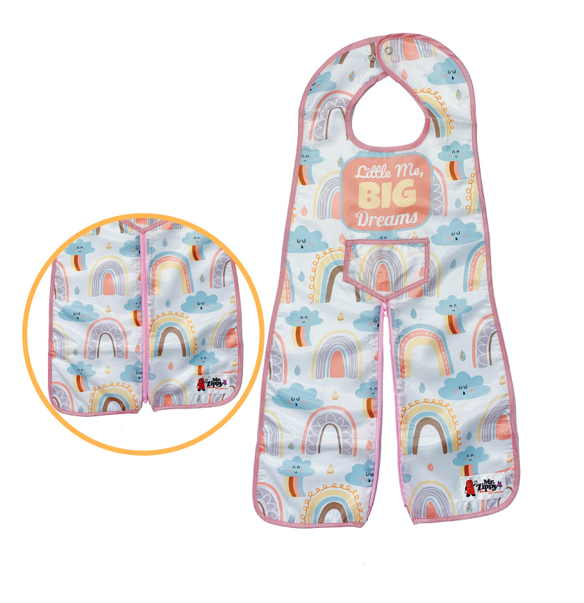This uniquely designed full-body bib with zippered legs protects against falling food from head to toe. It fastens snuggly at the neck with a snap closure, and zips apart at the bottom forming legs where elastic bands secure the bib legs to each of the child’s legs. Measures approximately 12” across and 25” from the neck down. Durable, waterproof easy-wipe, and machine washable. Crafted to use over and over again with your growing child from 6 to 36 months old.