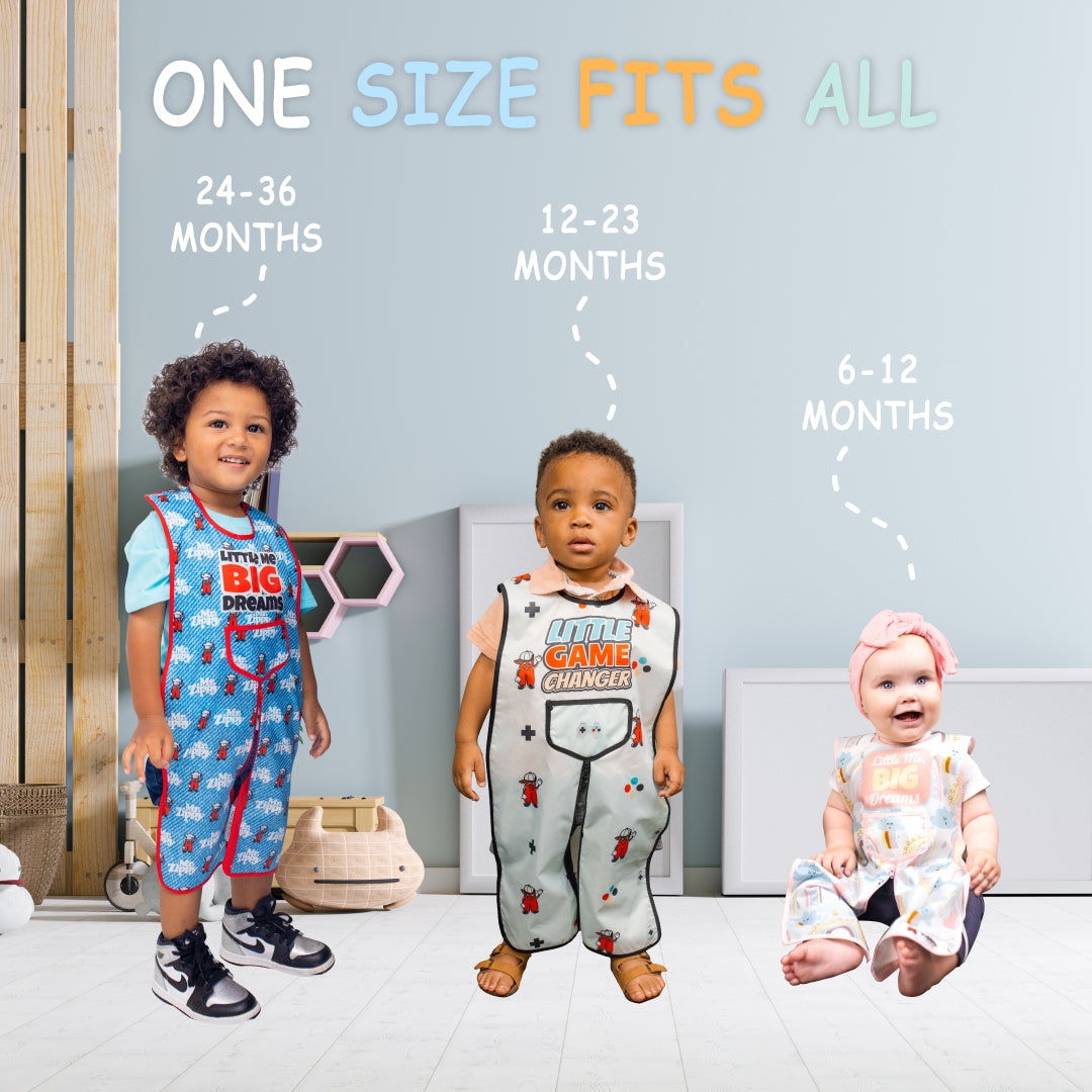 - Their bib fits 6 - 24 months and provides little coverage. Our bib grows with your child from 6 - 36 months and provides full body coverage.