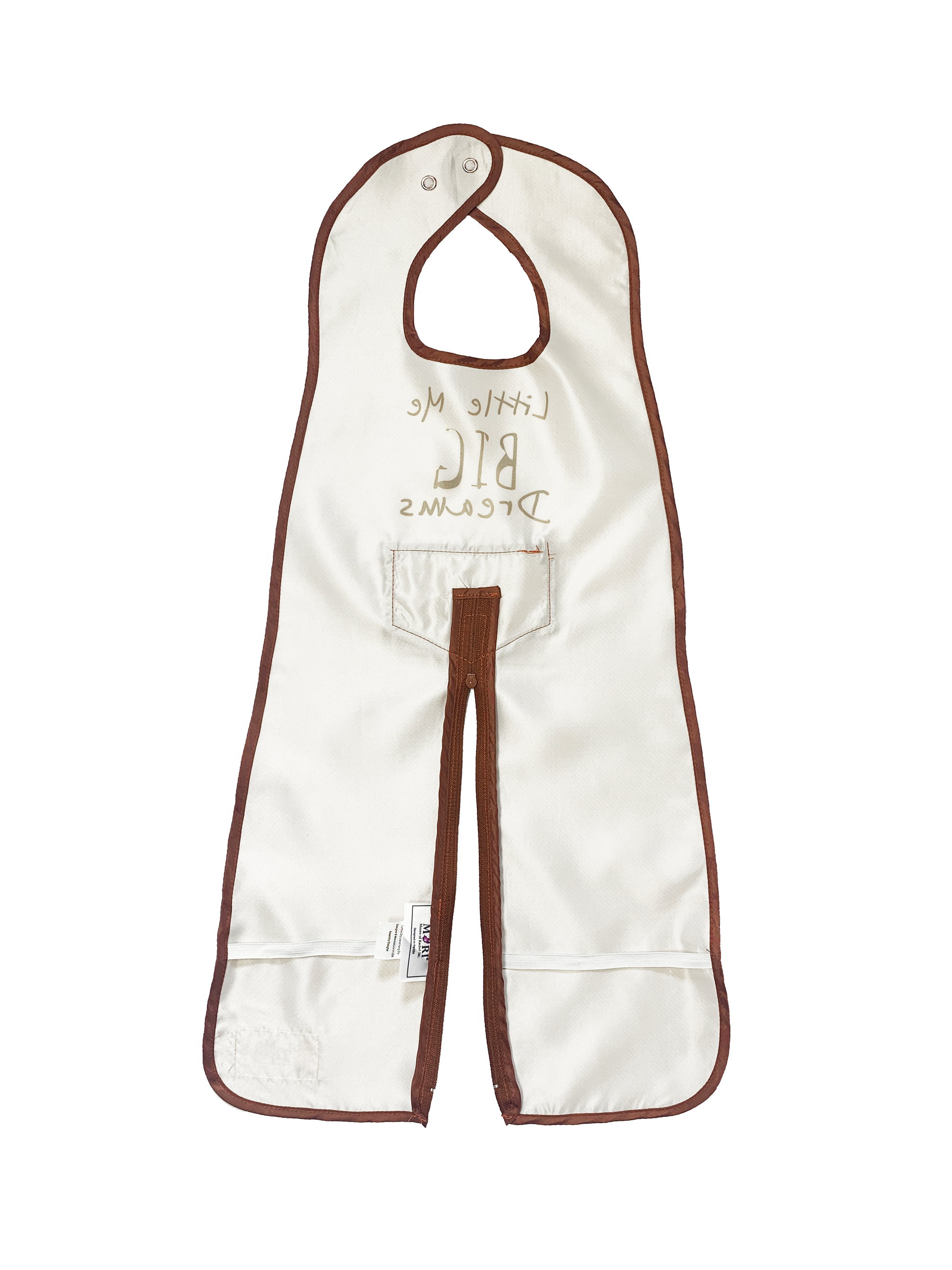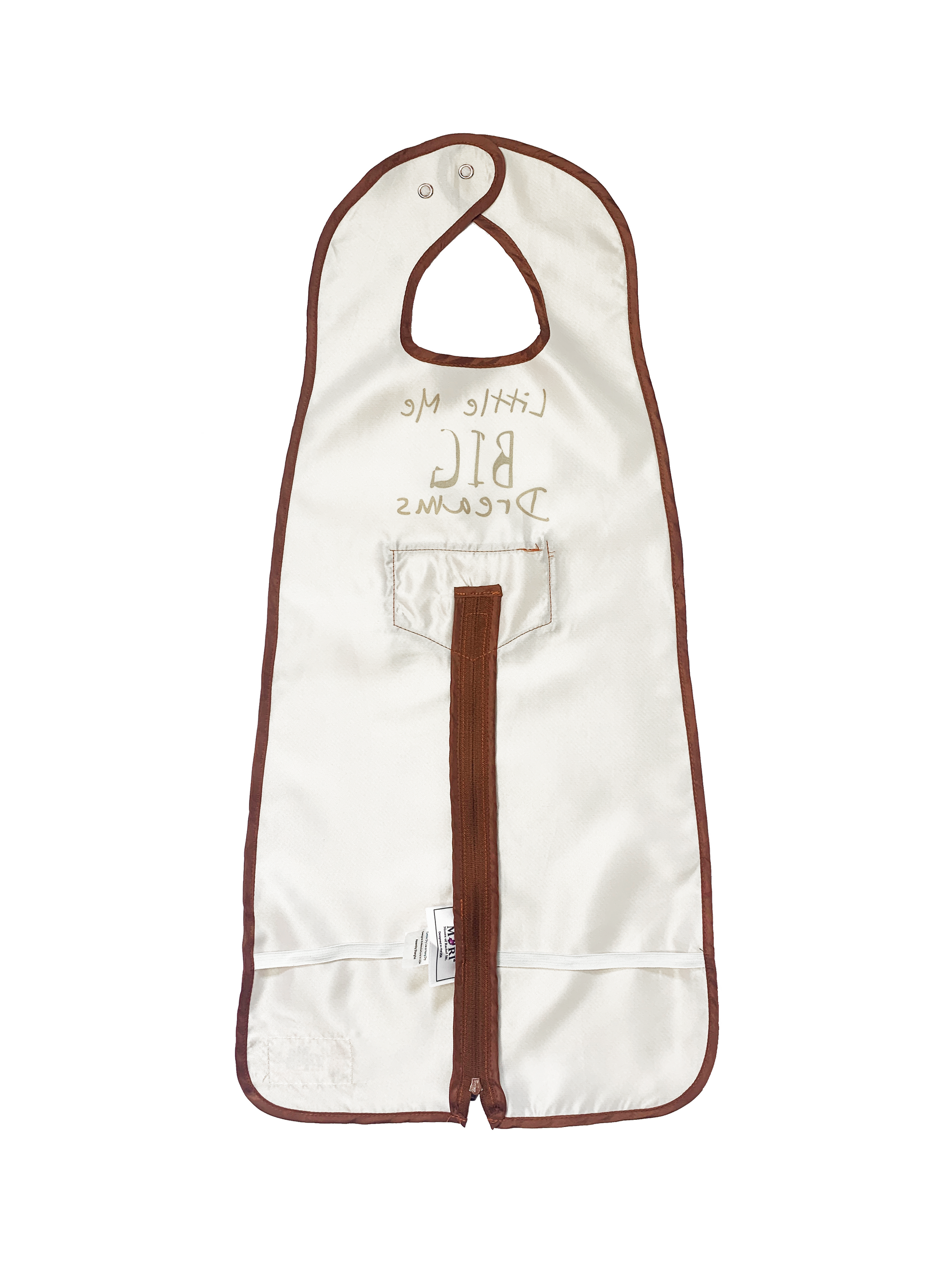 This uniquely designed full-body bib with zippered legs protects against falling food from head to toe. It fastens snuggly at the neck with a snap closure, and zips apart at the bottom forming legs where elastic bands secure the bib legs to each of the child’s legs. Measures approximately 12” across and 25” from the neck down. Durable, waterproof easy-wipe, and machine washable. Crafted to use over and over again with your growing child from 6 to 36 months old.