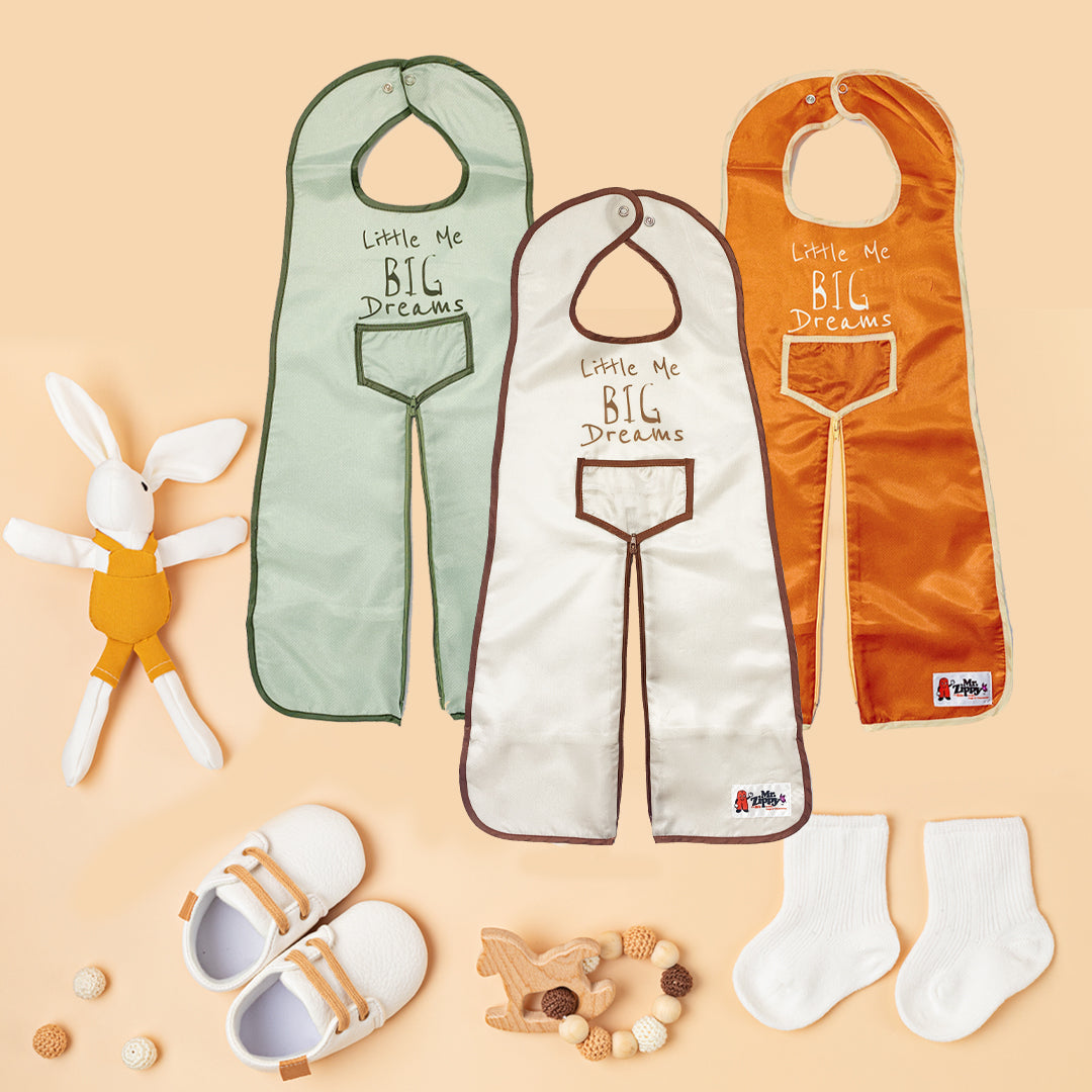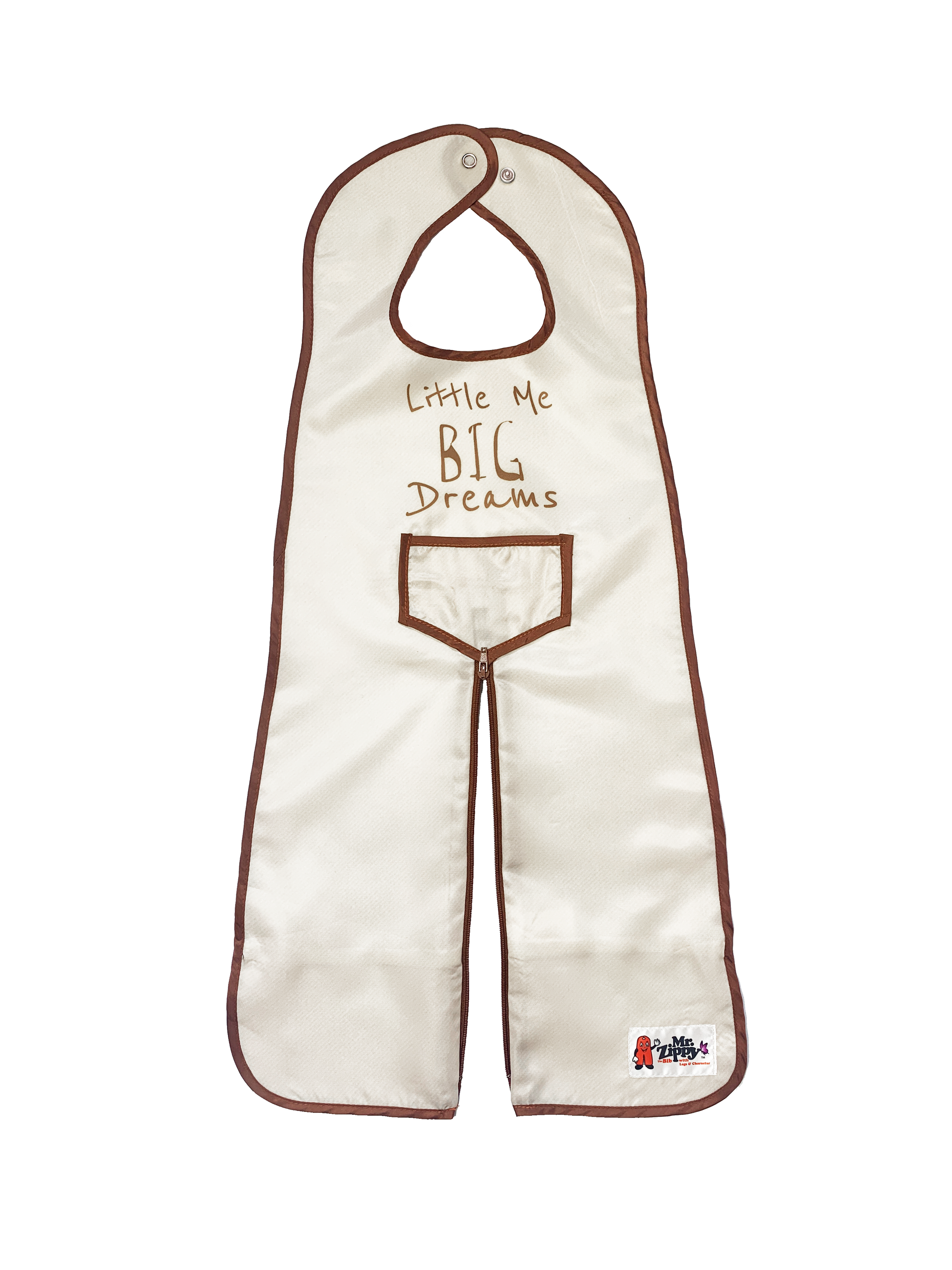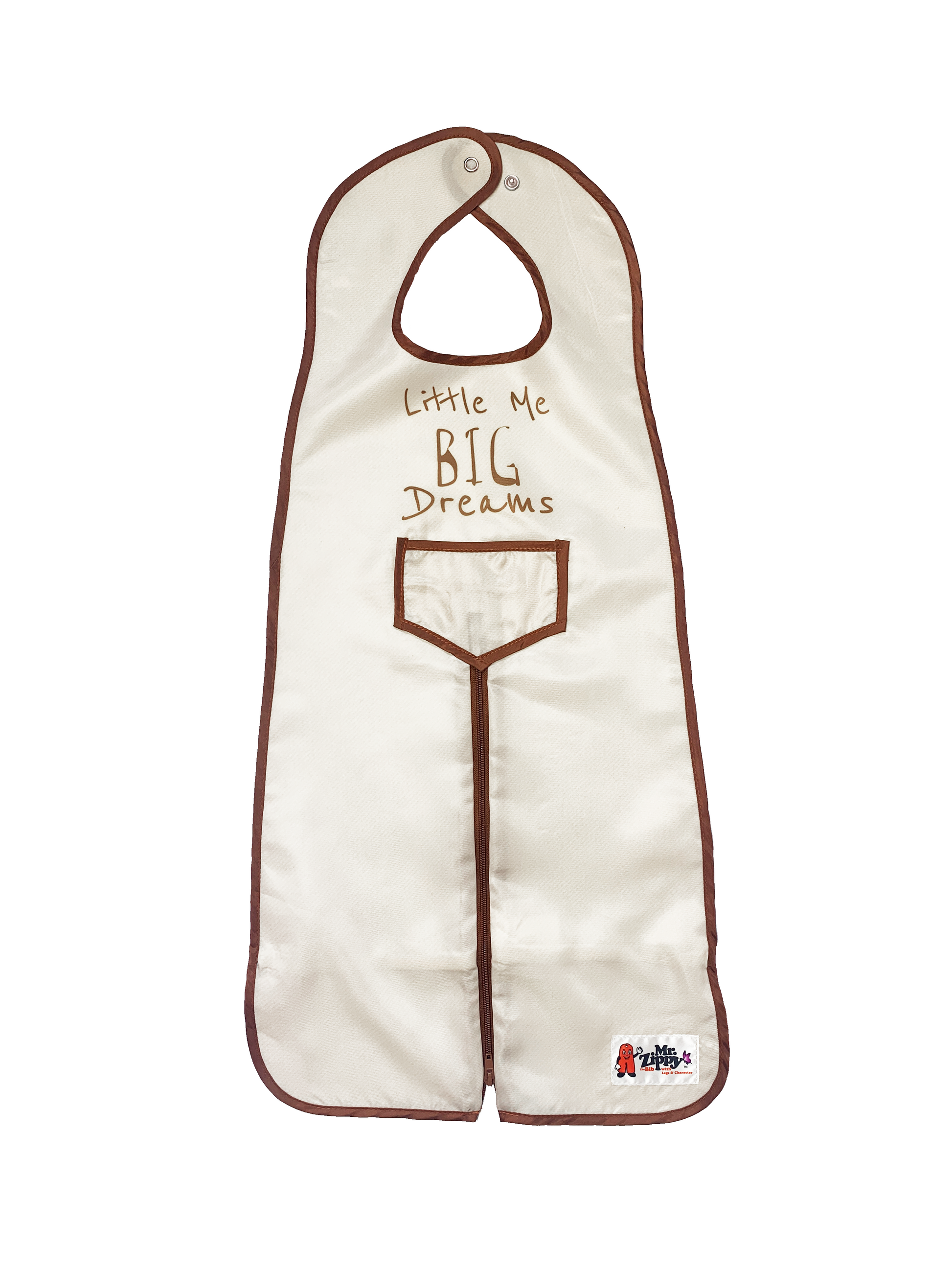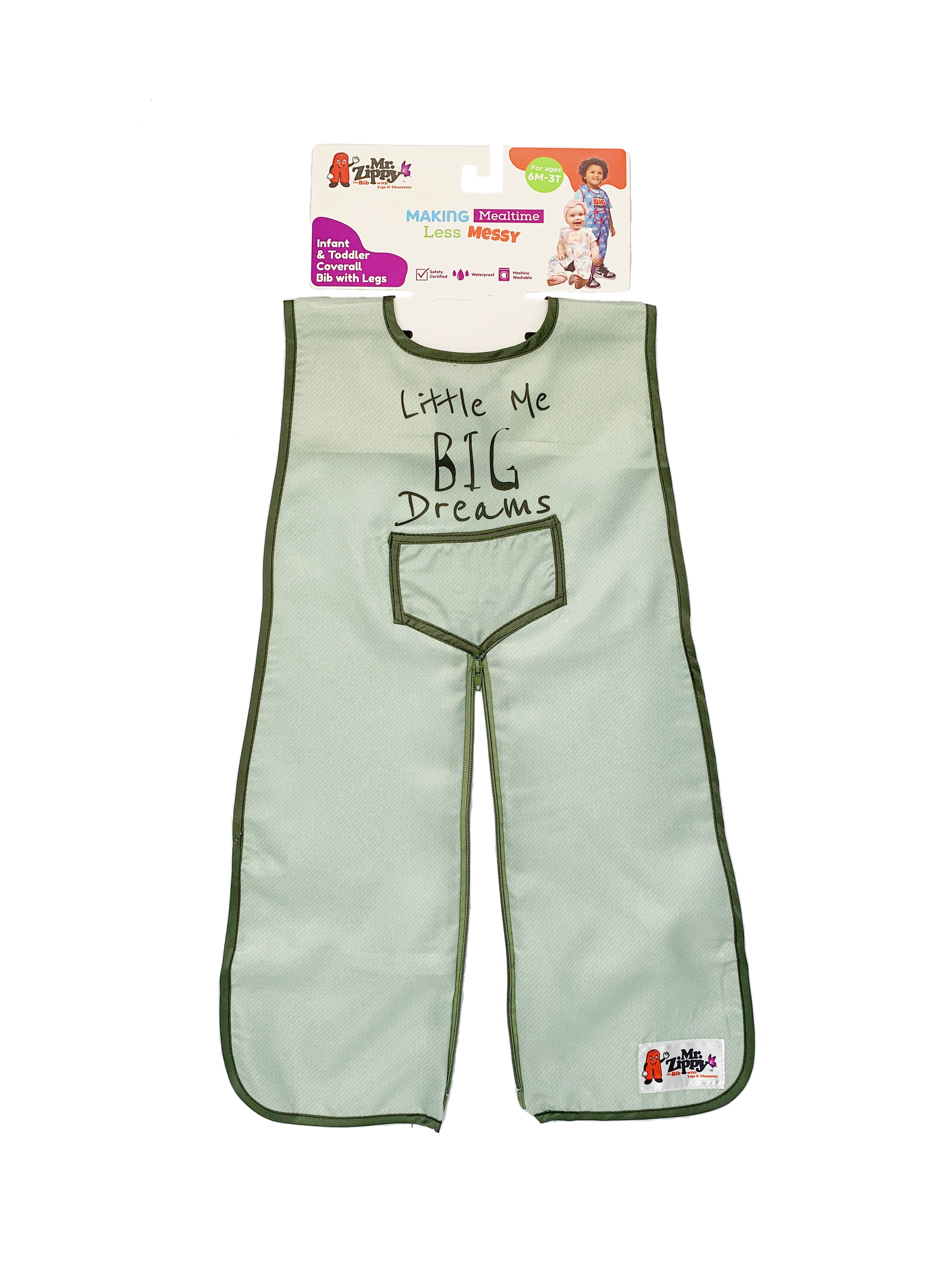 CUTE CLEVER DESIGN - ZIP OUT the Mess- This uniquely designed full-body bib with zippered legs protects against falling food from head to toe. It fastens snuggly at the neck with a snap closure and zips apart at the bottom forming legs where elastic bands secure the bib legs to each of the child’s legs. The adjustable neck closure has two snaps.