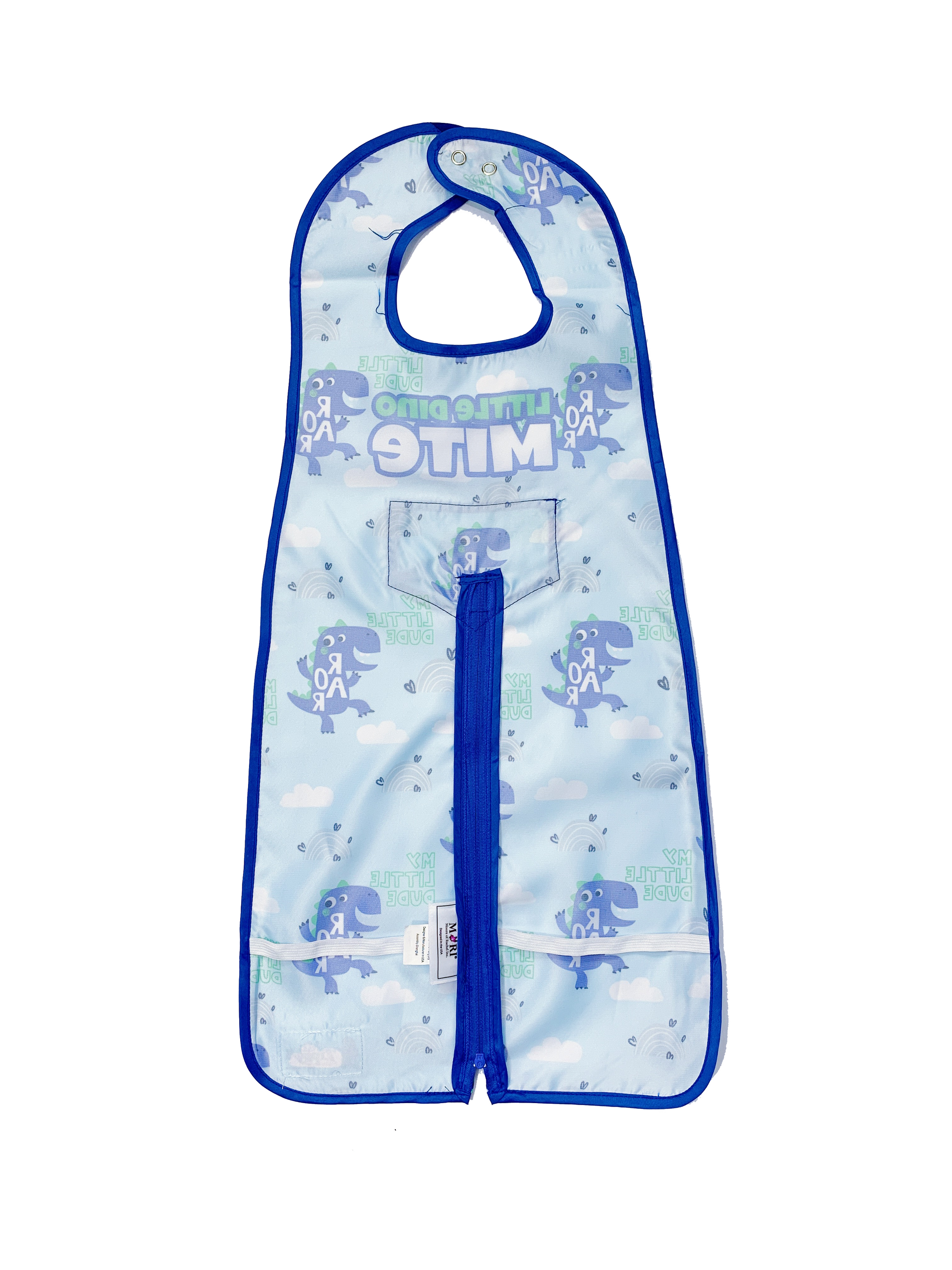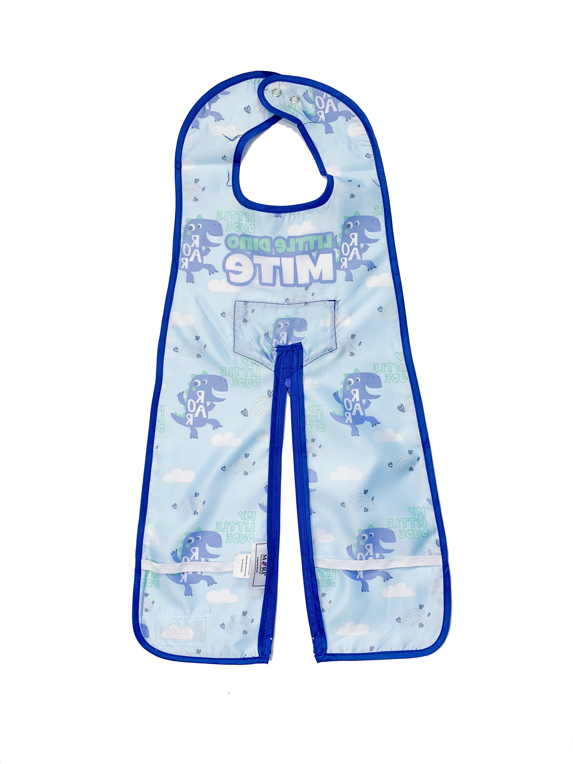 This uniquely designed full-body bib with zippered legs protects against falling food from head to toe. It fastens snuggly at the neck with a snap closure, and zips apart at the bottom forming legs where elastic bands secure the bib legs to each of the child’s legs. Measures approximately 12” across and 25” from the neck down. Durable, waterproof easy-wipe, and machine washable. Crafted to use over and over again with your growing child from 6 to 36 months old.