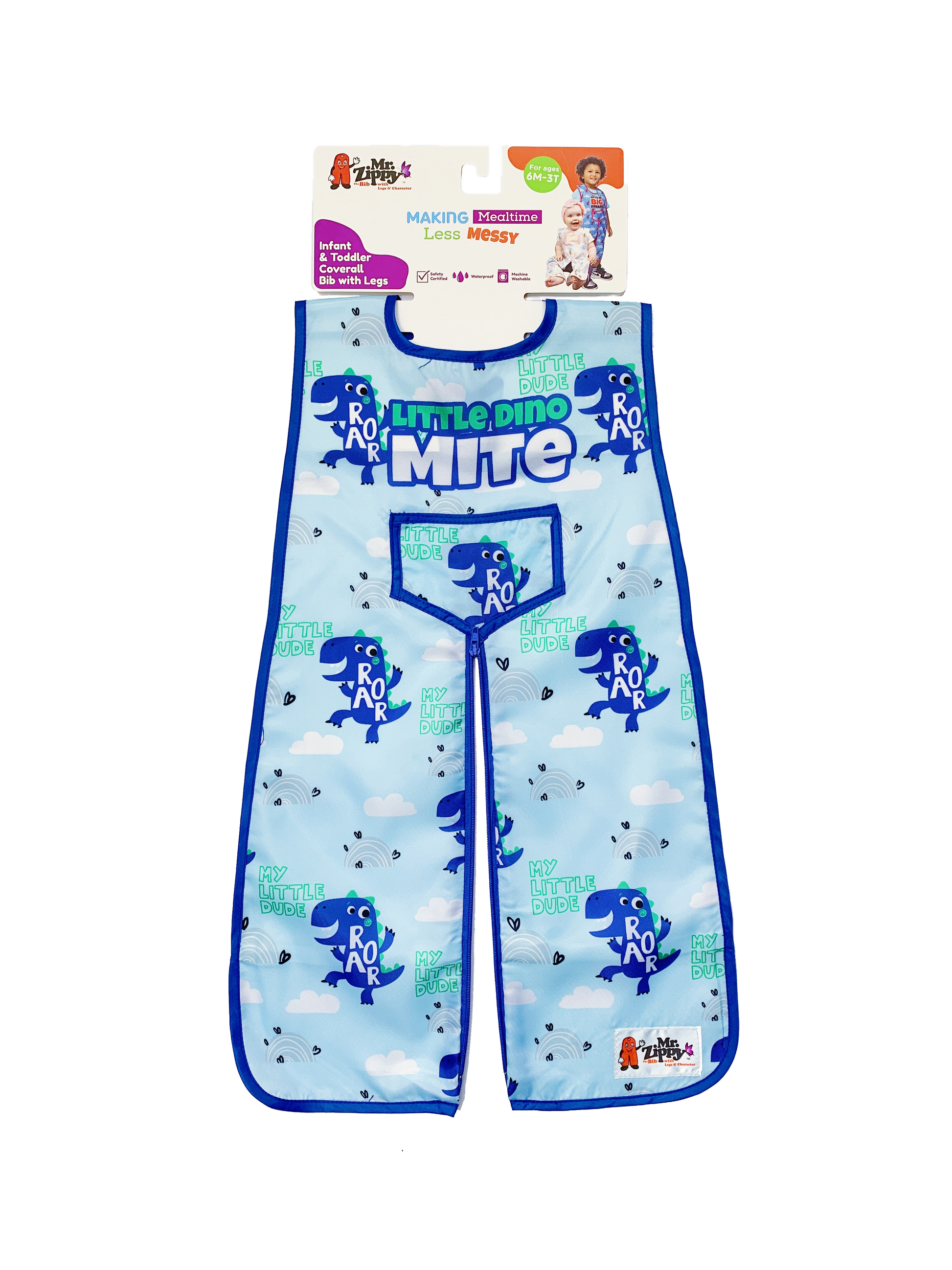 CUTE CLEVER DESIGN - ZIP OUT the Mess- This uniquely designed full-body bib with zippered legs protects against falling food from head to toe. It fastens snuggly at the neck with a snap closure and zips apart at the bottom forming legs where elastic bands secure the bib legs to each of the child’s legs. The adjustable neck closure has two snaps.